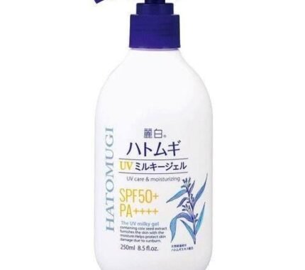 - “Rei white pearl barley UV milky gel 250ml” is a sunscreen lotion with natural moisturizing pearl barley extract.SPF 50+/PA+++ that can be used every day by the whole family