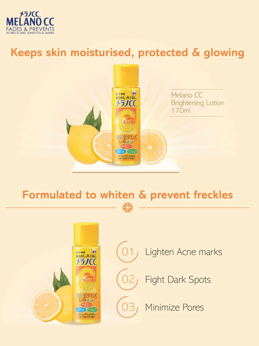 Product Description: Rohto Melano CC Medicated Brightening Lotion takes care of dark spots while thoroughly moisturizes your entire face. Skin-brightening vitamin C derivative penetrates the skin to go deep into the cells, controlling melanin production and preventing age spots and freckles. It has a refreshing citrus scent, and extracts of lemon and grapefruit allow you to have a better chance of obtaining better hydration on your skin.